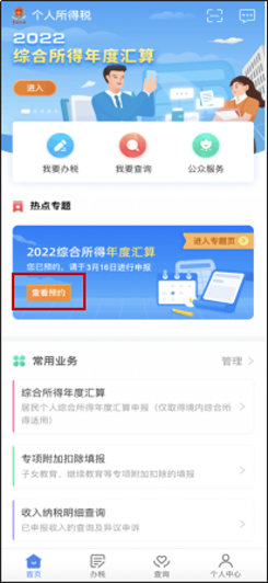第一步,纳税人登录手机个人所得税APP后,可通过“首页——2022综合所得年度汇算”专题区域点击“去预约”进入预约功能页面,也可以通过“办税——税费申报——综合所得年度汇算申报预约”进入预约功能界面。